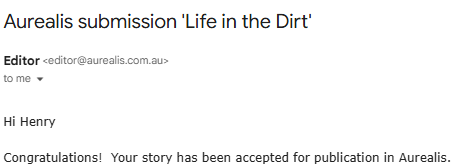 in August last year, my short story “Life in the Dirt” was published in Aurealis #173. It was my first paid writing credit, and a real milestone for me. I’d sent it off almost a year earlier, and had sort of forgotten about it, but the moment when I realised I would have a paid publishing credit in Australia’s premier spec fic magazine is kind of a fun story.