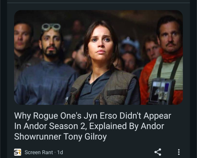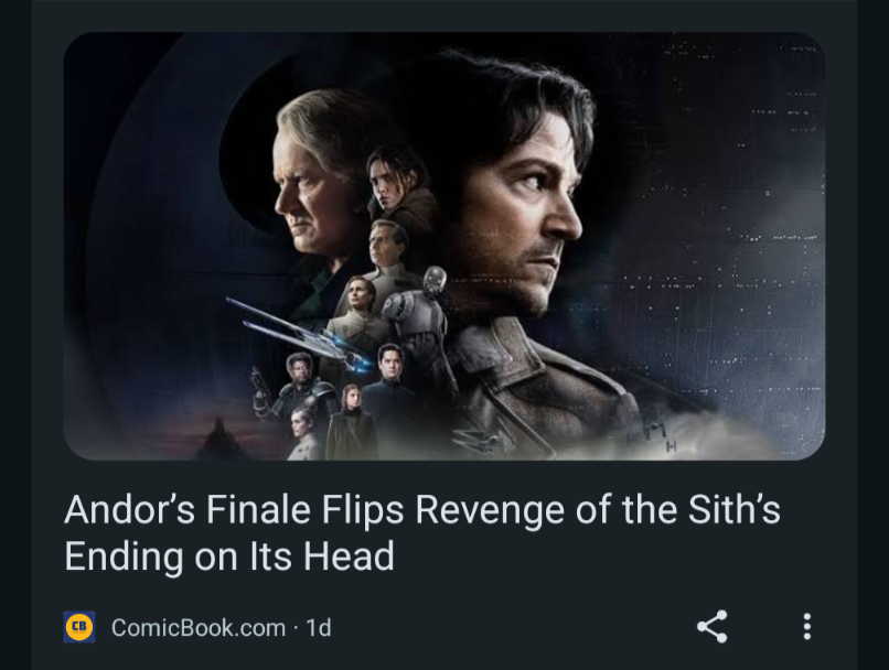 Andor’s final episodes were dedicated, as they were always going to have to be, to moving the characters around like chess pieces so that they’re in the places they need to be for the start of Rogue One to make any sense. Characters spent the last three episodes ping-ponging across the galaxy and getting haircuts so they look the same and are in the same place as they were in that one movie from a decade ago. Every single article I’ve seen about Andor talks about how great it is, and then talks about the implications for the greater lore. Here’s a couple of headlines that popped up on Google: