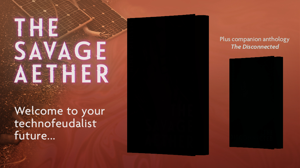 My new book THE SAVAGE AETHER and its companion anthology THE DISCONNECTED is going to be available on Kickstarter in two short weeks. It’s a Cyberpunk Horror story and I’ve been excited to bring this project to life for years now. In terms of genre, think less “Cyberpunk 2077” and more “Black Mirror”.